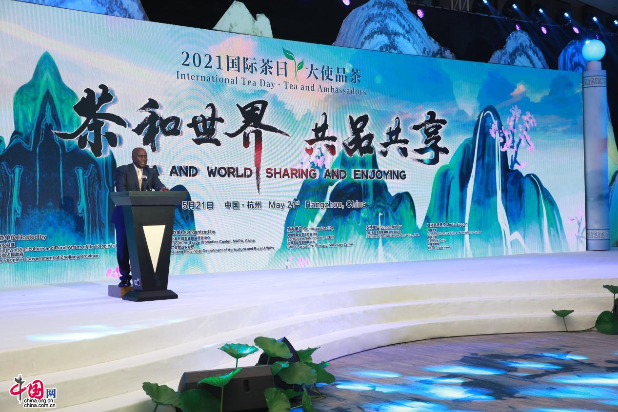 烏干達駐華大使克里斯普斯·基永加代表駐華使節發表致辭,向本次活動主辦方表示感謝,希望借助“國際茶日”加強中烏及全球茶產業交流合作,提升茶產業專業化、市場化、品牌化水平。