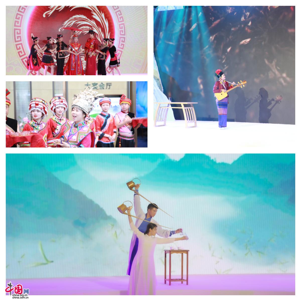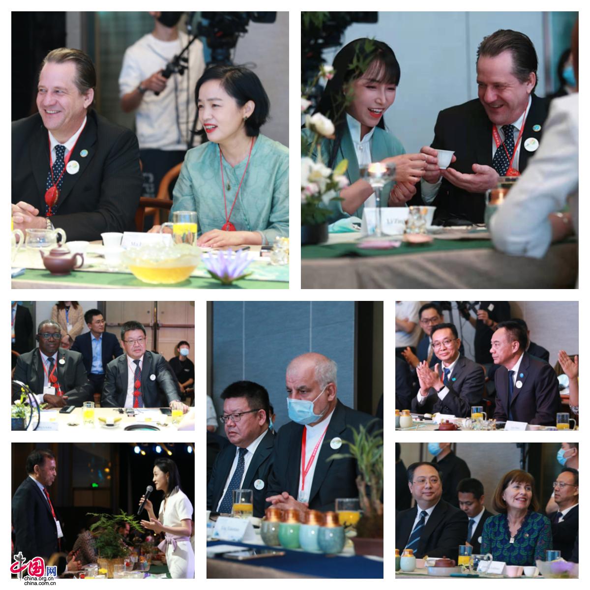 本場“大使品茶”是一場精彩絕倫的茶文化盛宴。一道湖北恩施土家族的“攔門茶”迎接中外嘉賓入場,“千年茶農”云南景邁山布朗族表演、福建畬族“新娘泡”文化展示、四川茶館文化和“龍行十八式”演繹、《南洋夜話》茶文化融合劇、茶韻旗袍秀等豐富多彩的節目輪番上演。活動現場,嘉賓分別品鑒了由苦至甘、回味悠長的云南普洱茶,濃醇鮮爽、葉亮紅明的福建坦洋工夫茶,湯色綠亮、清新爽口的洪雅綠茶,香高味濃、形美色亮的川紅工夫茶以及“紅濃陳醇”、特有檳榔香氣的廣西六堡茶。